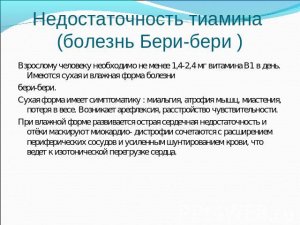 Бери-бери – заболевание организма человека, возникает при дефиците витамина В1 (тиамина). Витамин требуется для естественного протекания углеводного и жирового обменов. Дефицит витамина В1 способствует избыточному накоплению в крови пациента пировиноградной кислоты. Происходит нарушение функционирования пищеварительной системы, нервной, сердечно-сосудистой систем. Тиамин нужен для нормального развития и роста человека.