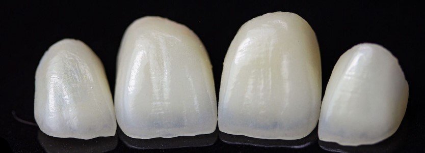 Керамические виниры изготавливаются из высококачественного стоматологического фарфора или дисиликата лития (E-max) в зуботехнической лаборатории по индивидуальным слепкам. Они фиксируются на зубах с помощью специального адгезивного состава.
