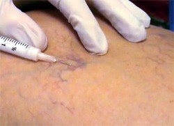 Лечебный сеанс склеротерапии проходит следующим образом. Перед началом процедуры у пациента в вертикальном положении производится маркировка места пункции. Потом пациент ложится на кушетку, нога в горизонтальном положении забинтовывается от самой стопы до места введения первой инъекции. После того, как кожа будет обработана дезинфицирующим раствором, вводится несколько инъекций. Их количество зависит от формы варикоза. Требуется от 3-7 инъекций при магистральной форме до 10-20 при телеангиэктазии. По окончании операции нога обвязывается специальным эластичным бинтом или надевается компрессионный чулок, который нужно будет носить круглосуточно.